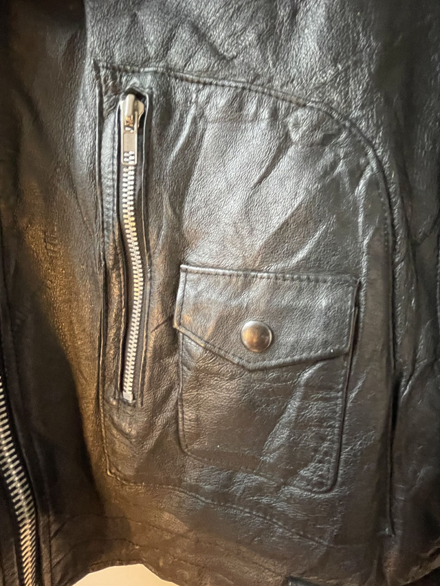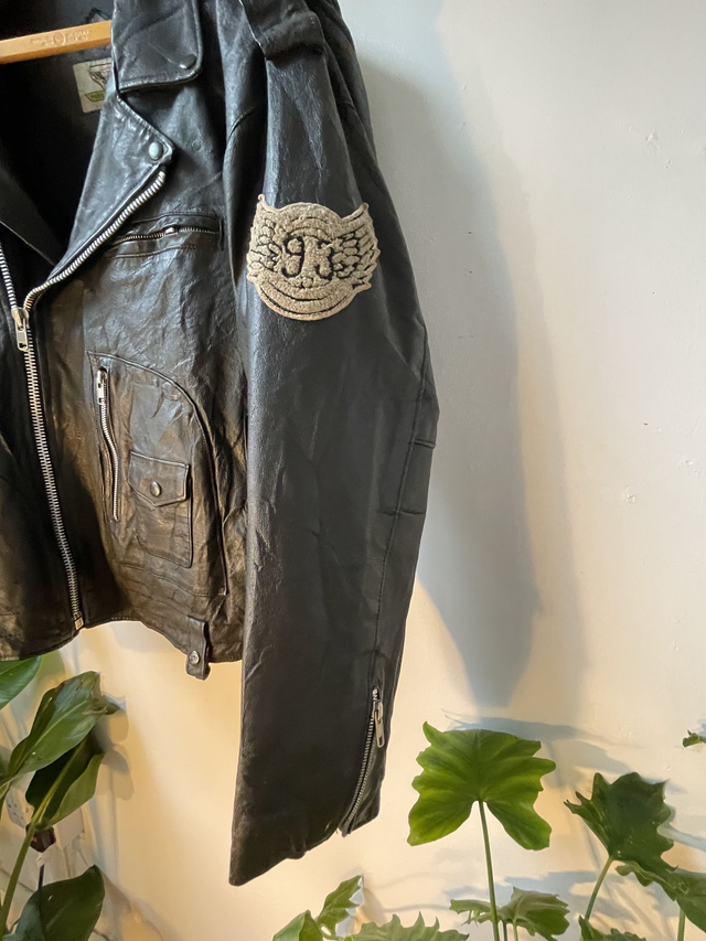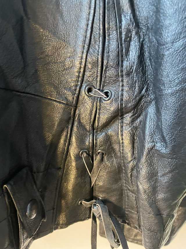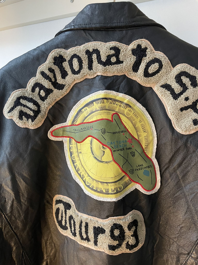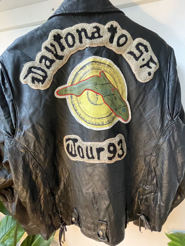 This is a rare, 1993 'Dayton to S.F Tour', black leather biker jacket by Pere Mar. It has multi pocketed zip and stud fastening detail on the front, lace up detail on the back and snap shut shoulder straps. With embroidered detail and emblem on the back and side arm. This leather jacket is in very good vintage condition. Label size L